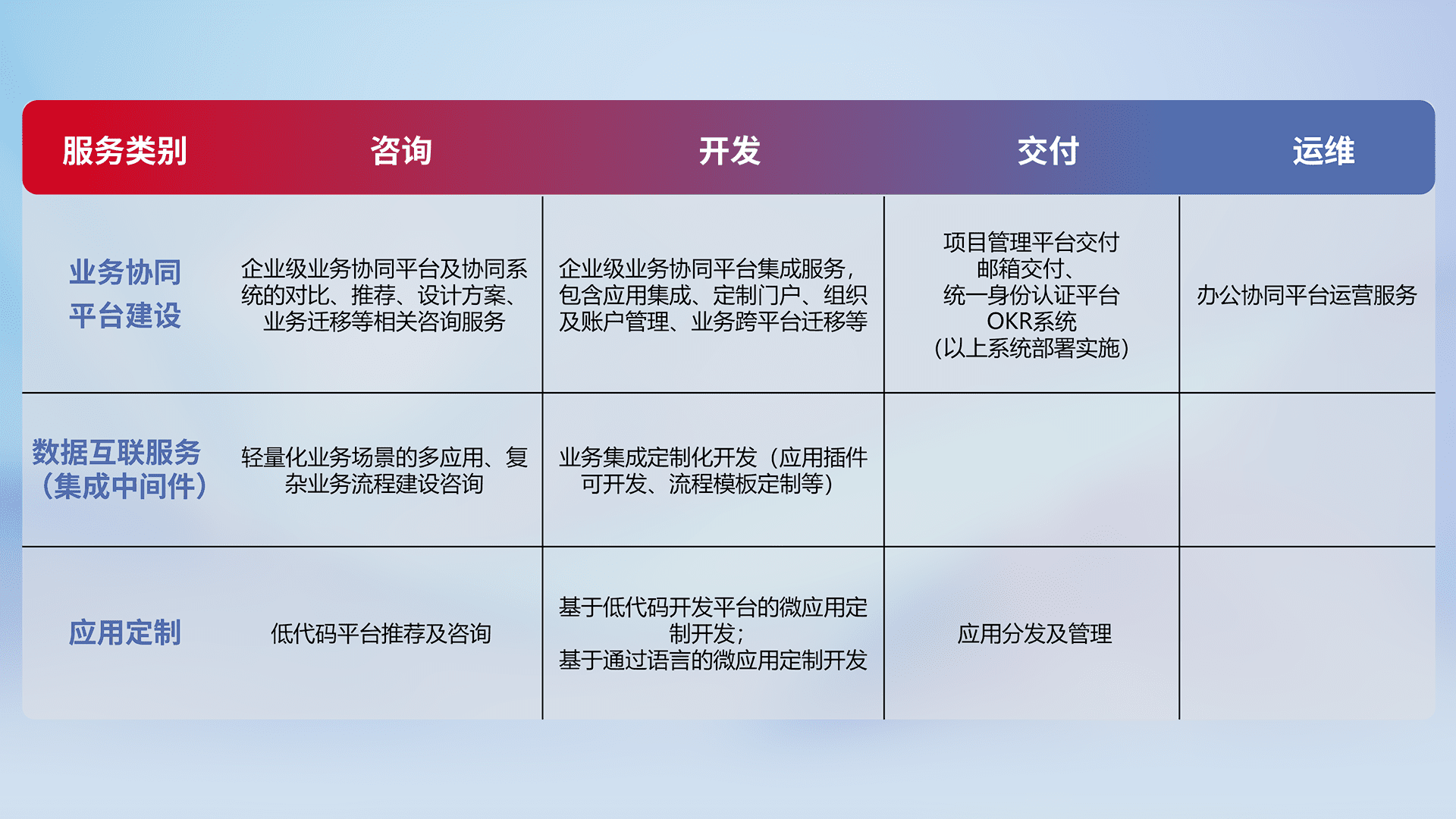 针对钉钉、、企微、、IDaas等平台级产品提供产品的规划、、方案、、、交付、、、、定制化开发等服务,,,,实现如统一协同办公、、智能客户服务、、、混合会议管理、、、、智能数据查询、、、等业务场景,,实现数字化转型。。。